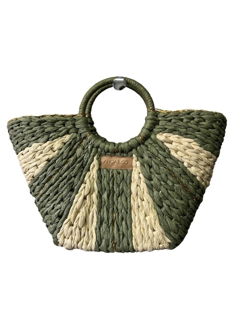 Descubrí el Bolso PALOMA de ANCA&CO, una cartera de mano elegante con un entrejido bicolor natural y verde, realzado con hilos dorados que le aportan un toque sofisticado. Está forrada y cuenta con manijas circulares revestidas para un agarre cómodo y seguro.