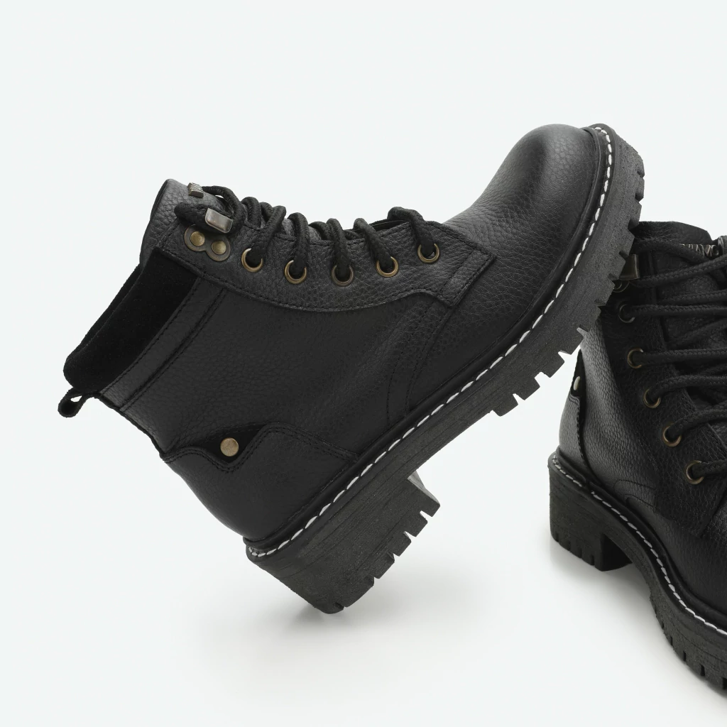 Diseño y confección argentino. Fabricado en cuero graneado combinado con descarne . Fondo de TR. Detalles: ojalillos, alpinos, cordónes, remaches.