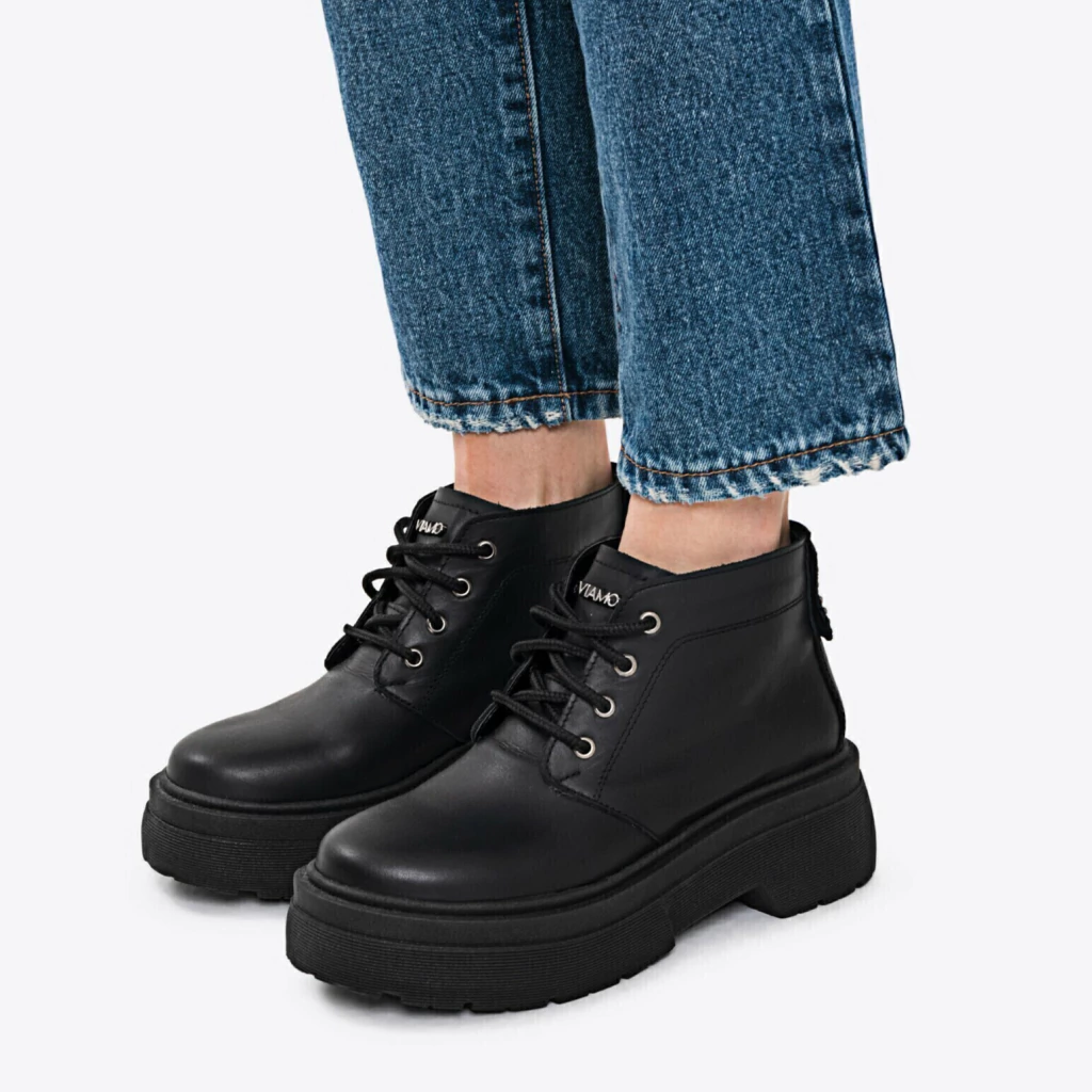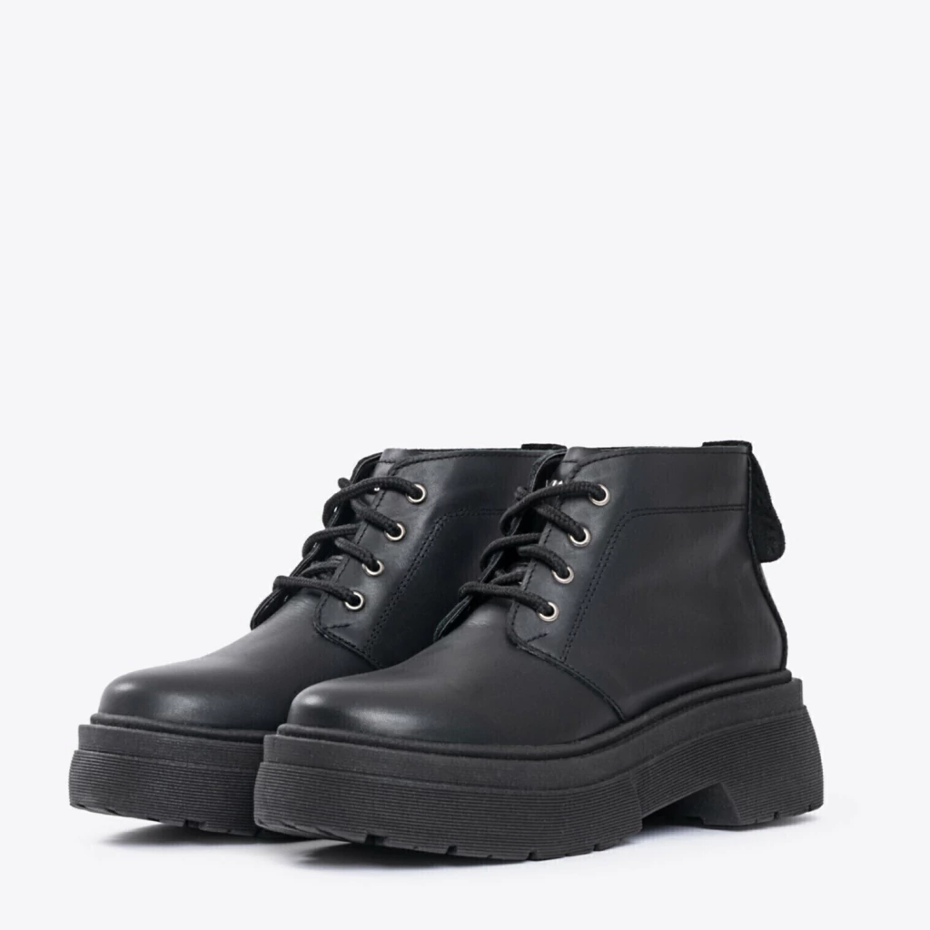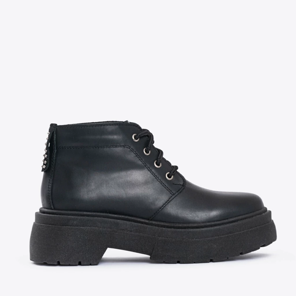 Borcego de mujer en cuero, de caña baja. Base inyectada. Detalle de tachas, ojalillos y avio marcario en lengüeta.