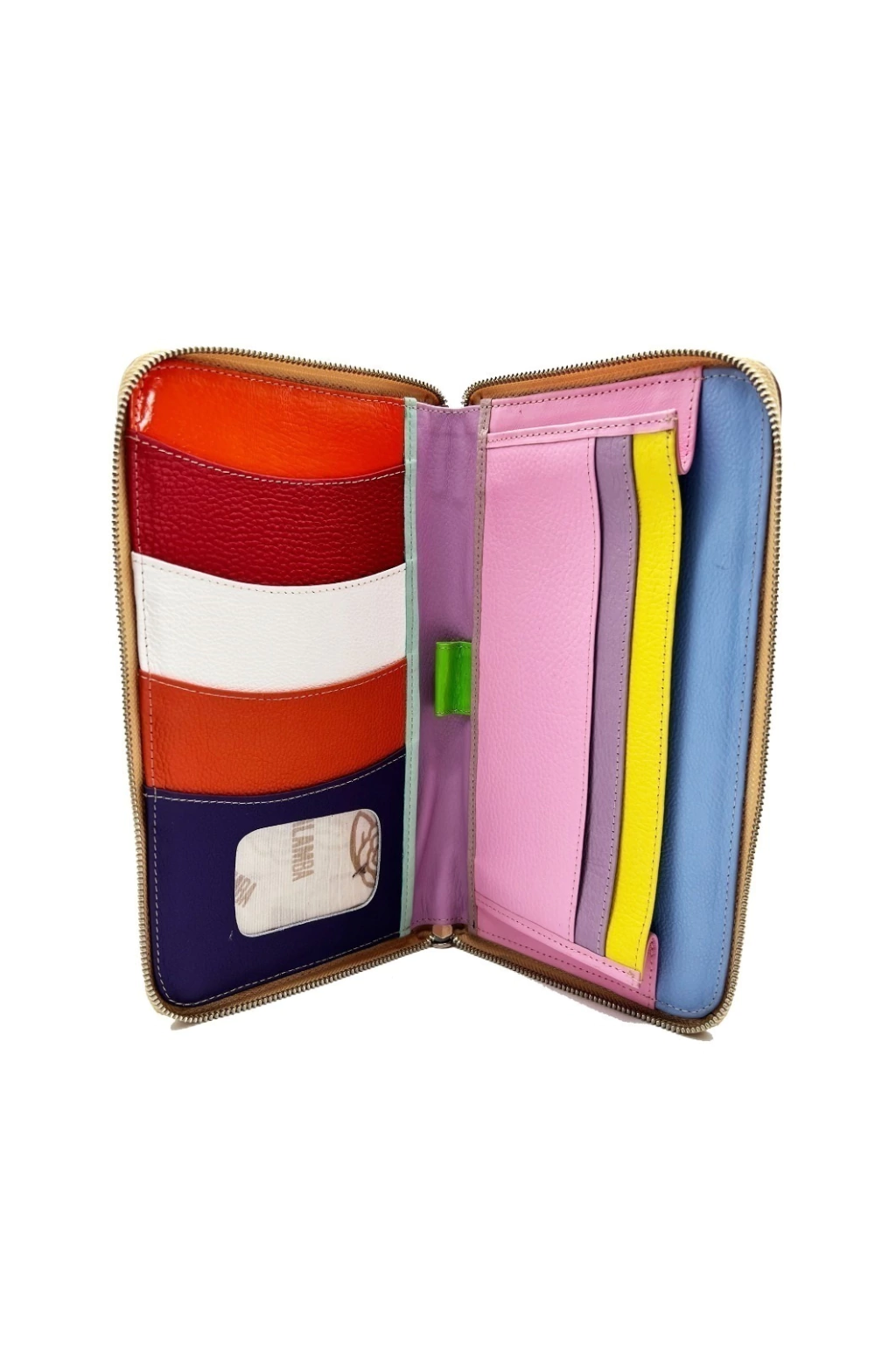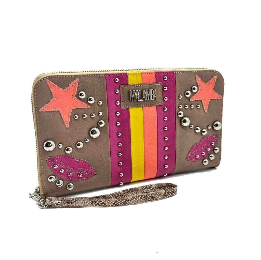 Billetera porta pasaportes de tamaño maxi confeccionada 100% en cuero vacuno con manija para que puedas llevarla como sobre. Sobre el frente posee diversas formas texturas y recorridos de tachas que acompañan la tapa super unica que tiene. Interior forrado en algodón estampado, con múltiples divisiones para organizar tus ítems personales (documentos, pasaportes, dinero, lapicera, chequera) en cuero multicolor. Acceso mediante cierre metálico ykk importado.