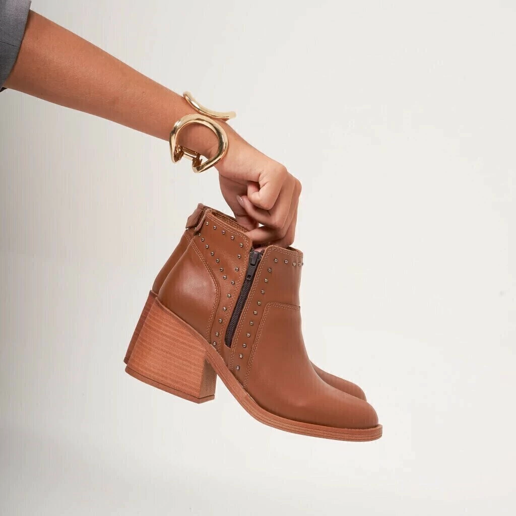DescubrI la elegancia y comodidad de nuestras botas de caña baja de cuero vacuno. Con un diseño sofisticado, presentan detalles en el talón con tachas metálicas que añaden un toque único.