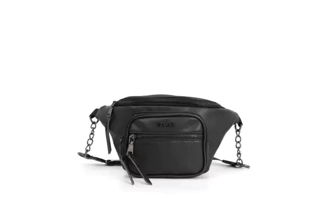 Riñonera de cuero sintético liso con detalle de cierres a contratono, correa regulable con aplique de cadenas metálicas y bolsillo frontal. Altura: 13cm - Largo: 27cm - Ancho: 7cm.